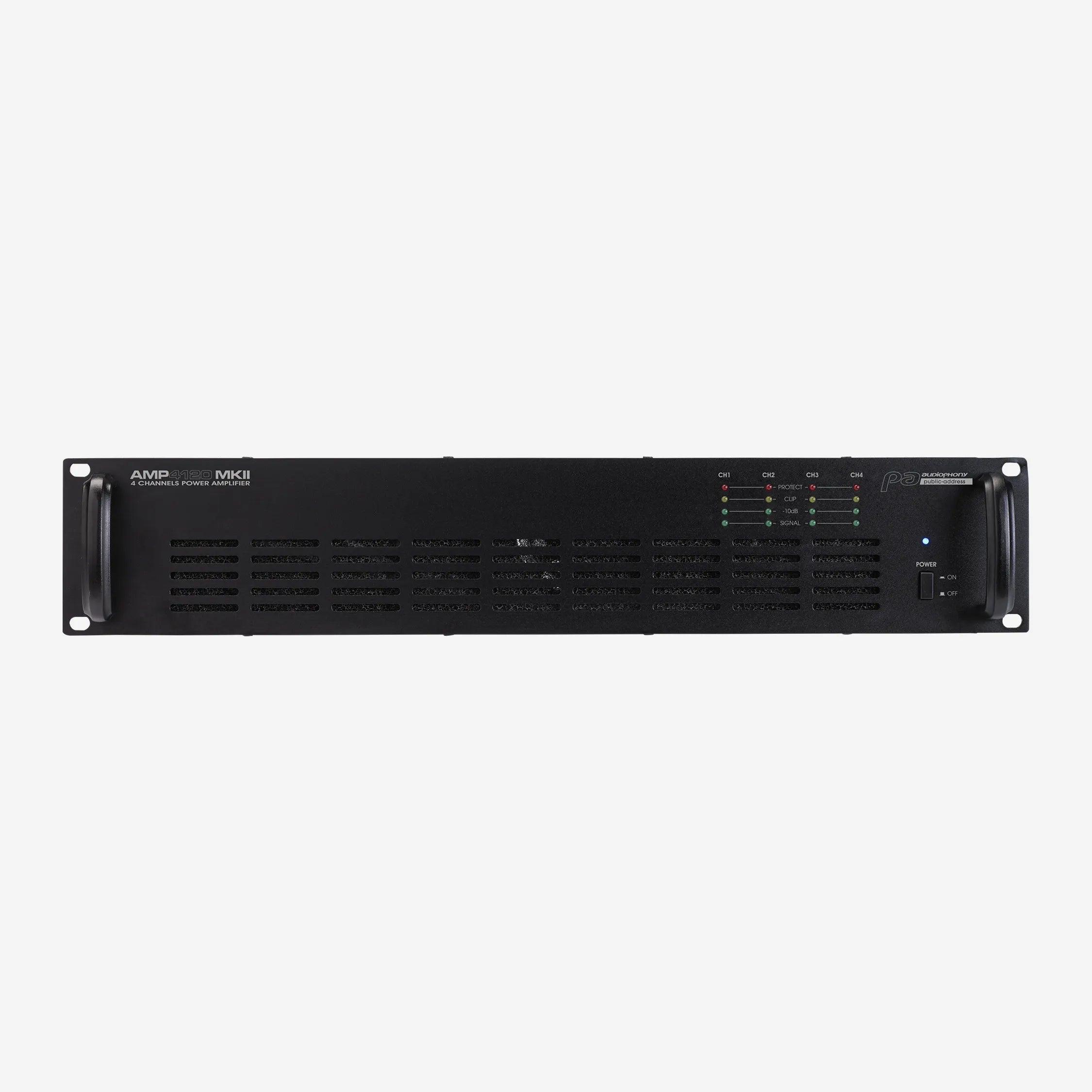 L’AMP4120 MKII est un amplificateur Public Address 4 canaux délivrant 4 × 120 W en ligne 100 V. Il dispose de 4 entrées mono et 4 sorties haut-parleurs sur connecteurs Phoenix, ainsi que de 4 sorties ligne pour liaison vers d’autres équipements.